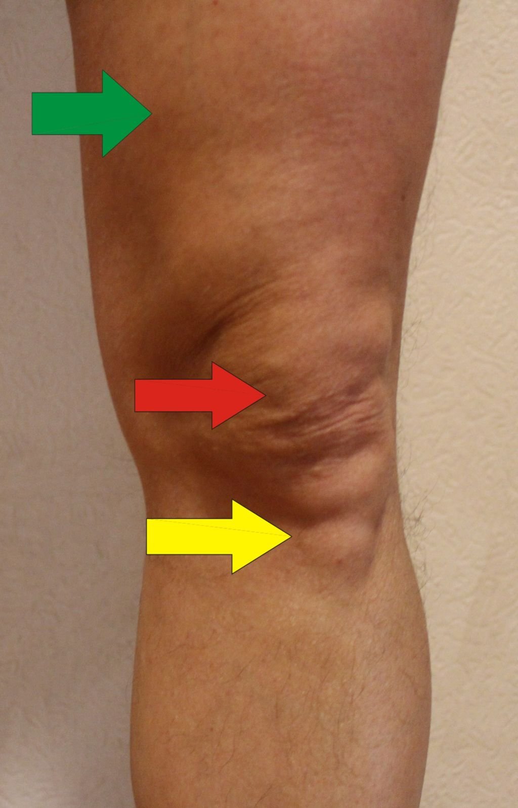 Das Patellaspitzensyndrom ist eine chronische, degenerative, schmerzhafte Erkrankung der Sehne des Quadricepsmuskels (Bild, grüner Pfeil), die unterhalb der Kniescheibe (Bild, roter Pfeil) ansetzt (Bild, gelber Pfeil). Gelegentlich wird das Patellaspitzensyndrom auch als Springerknie bezeichnet weil es gerade auch bei Menschen vorkommt, die Sprungsportarten, wie zum Beispiel Volleyball, Basketball oder Handball praktizieren. Bei diesen Sportarten kommt es zur wiederholten maximalen starken Beanspruchung der Quadricepssehne, die durch diese ständig wiederholten starken Reize Schaden nimmt.